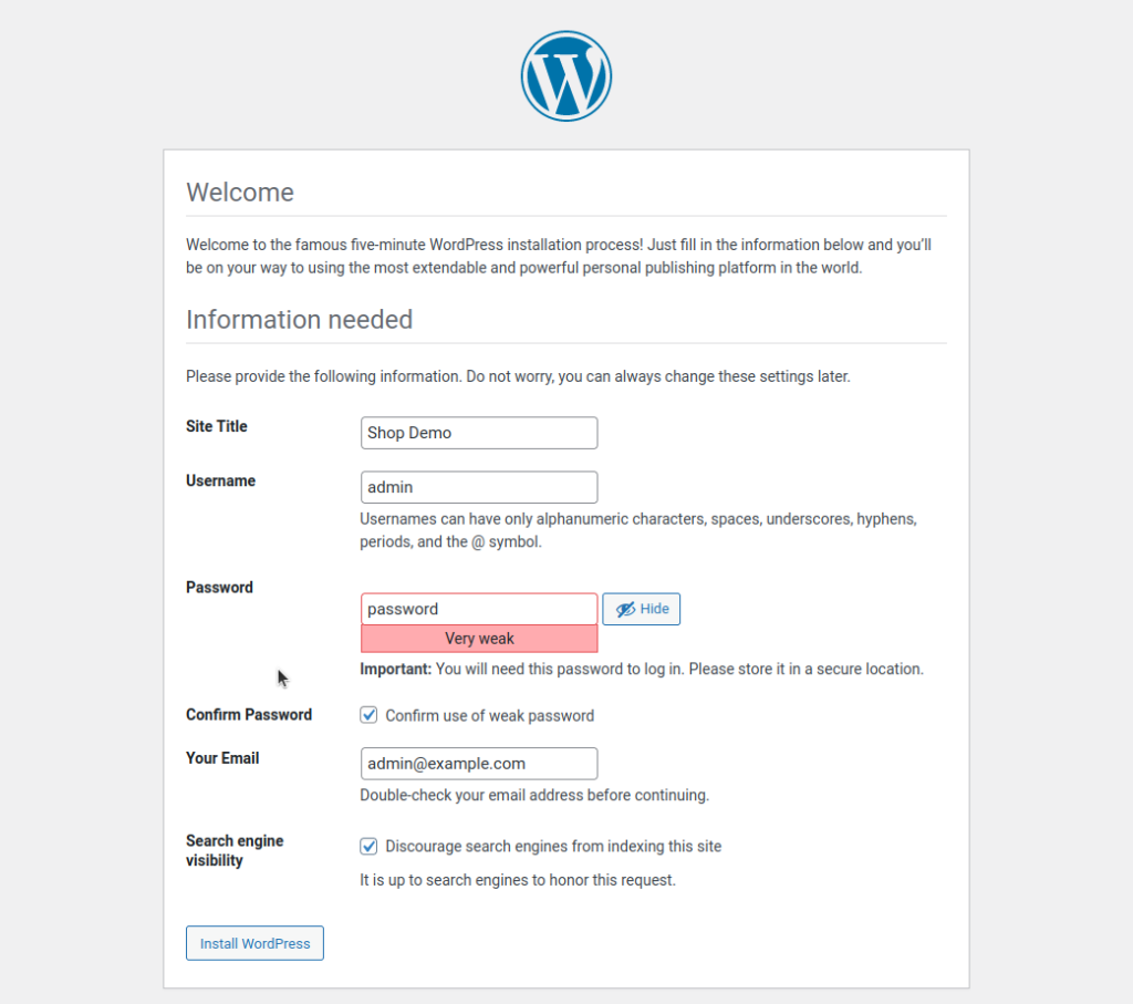 docker-compose upOnce Docker has successfully started, you can complete your WordPress installation by navigating to http://localhost:8080/wp/wp-admin.