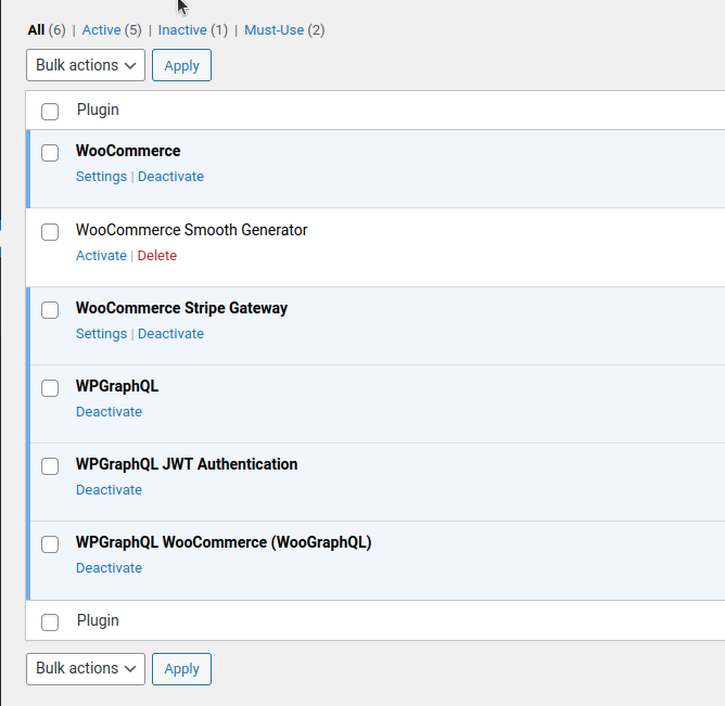 Now that our WordPress site is up and running, let's activate the necessary plugins and set up our store. From your WordPress Dashboard, navigate to the Plugins page and activate the following: WooCommerce, WPGraphQL, and WPGraphQL WooCommerce.